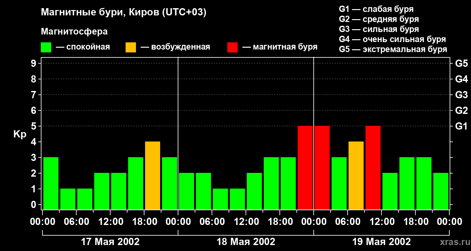 Изменения геомагнитного индекса Kp с 17 по 19 мая 2002 года для средних широт