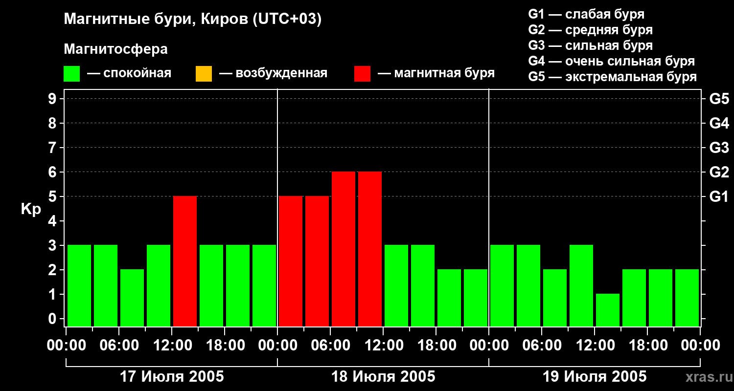 Изменения геомагнитного индекса Kp с 17 по 19 июля 2005 года для средних широт
