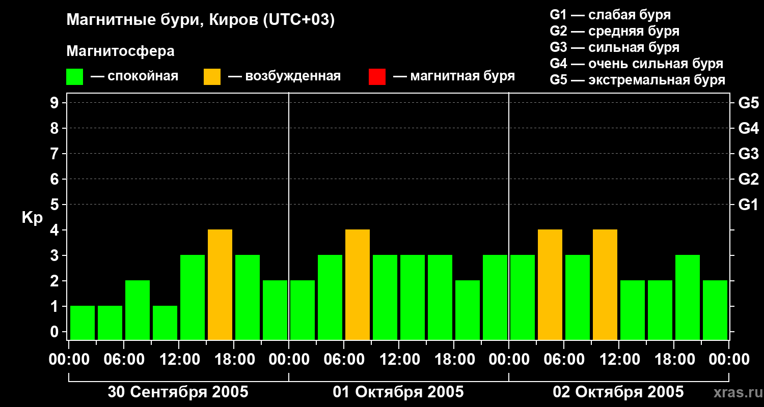 Изменения геомагнитного индекса Kp с 30 сентября по 2 октября 2005 года для средних широт