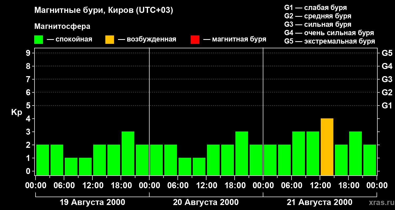 Изменения геомагнитного индекса Kp с 19 по 21 августа 2000 года для средних широт