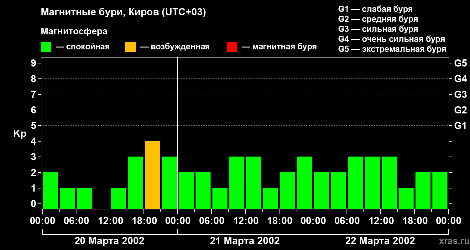 Изменения геомагнитного индекса Kp с 20 по 22 марта 2002 года для средних широт