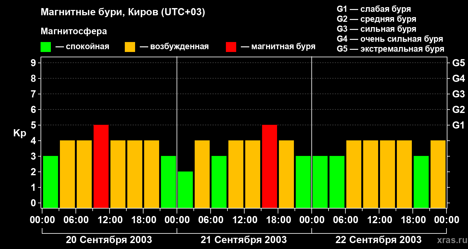 Изменения геомагнитного индекса Kp с 20 по 22 сентября 2003 года для средних широт