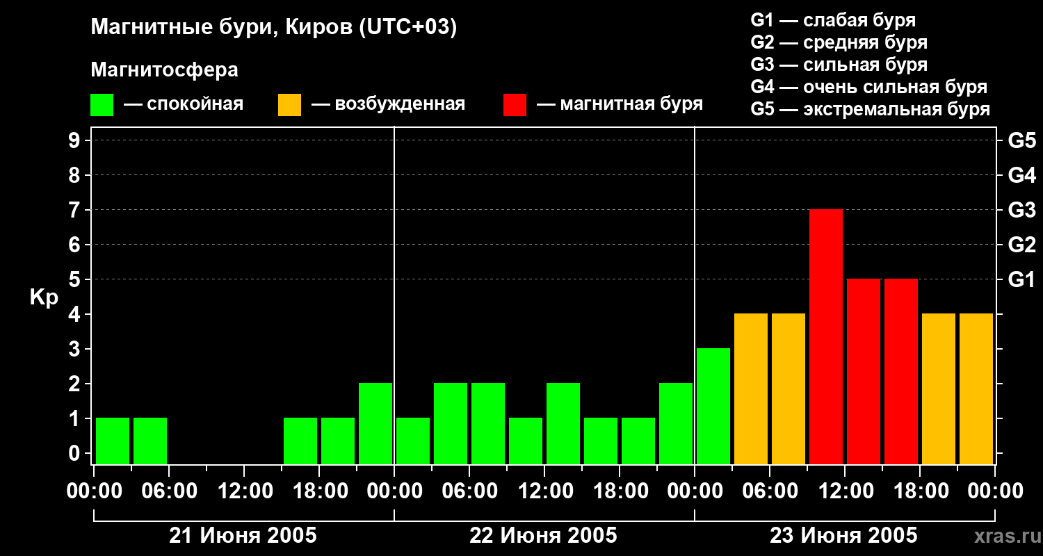 Изменения геомагнитного индекса Kp с 21 по 23 июня 2005 года для средних широт