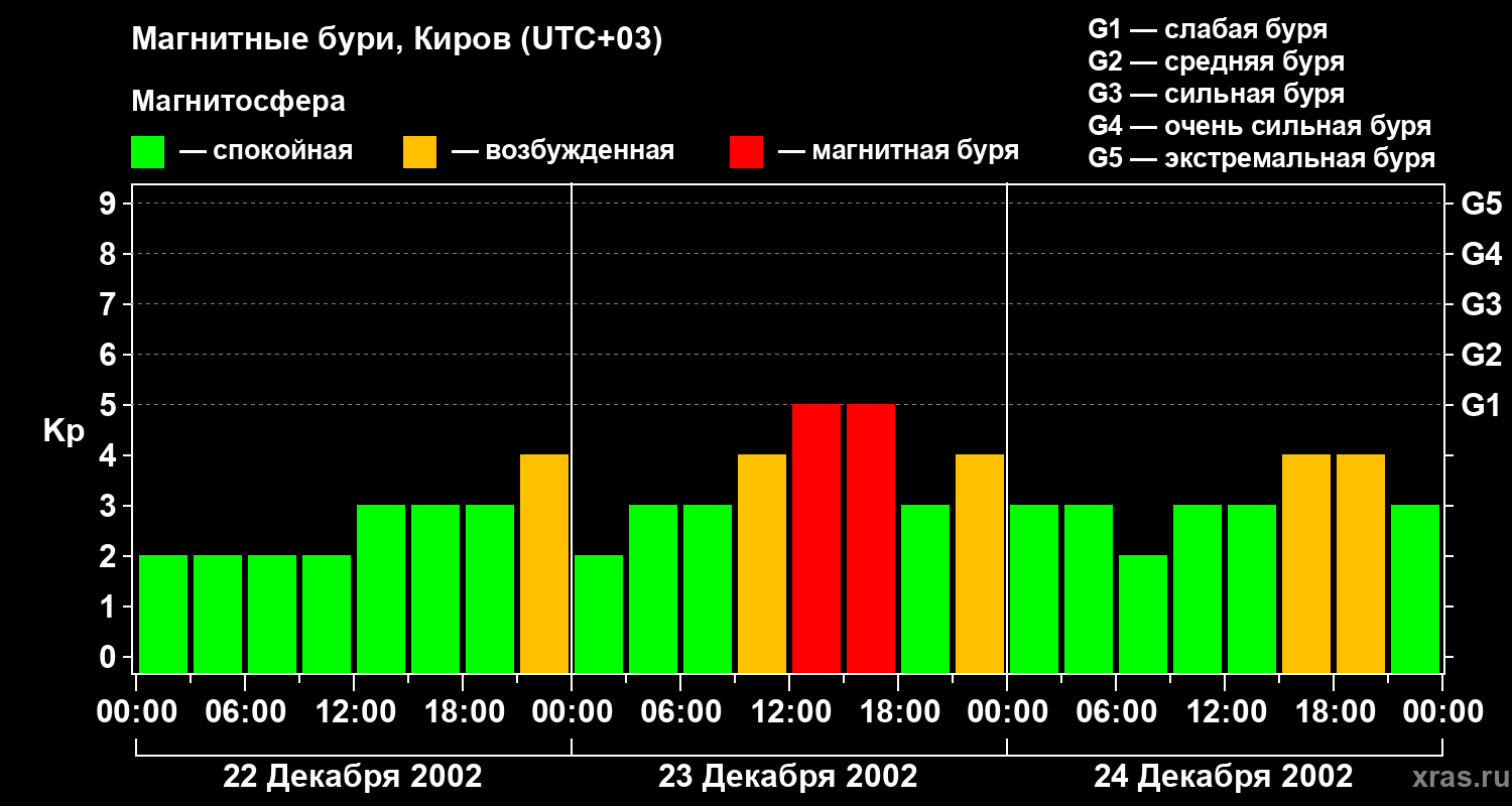 Изменения геомагнитного индекса Kp с 22 по 24 декабря 2002 года для средних широт
