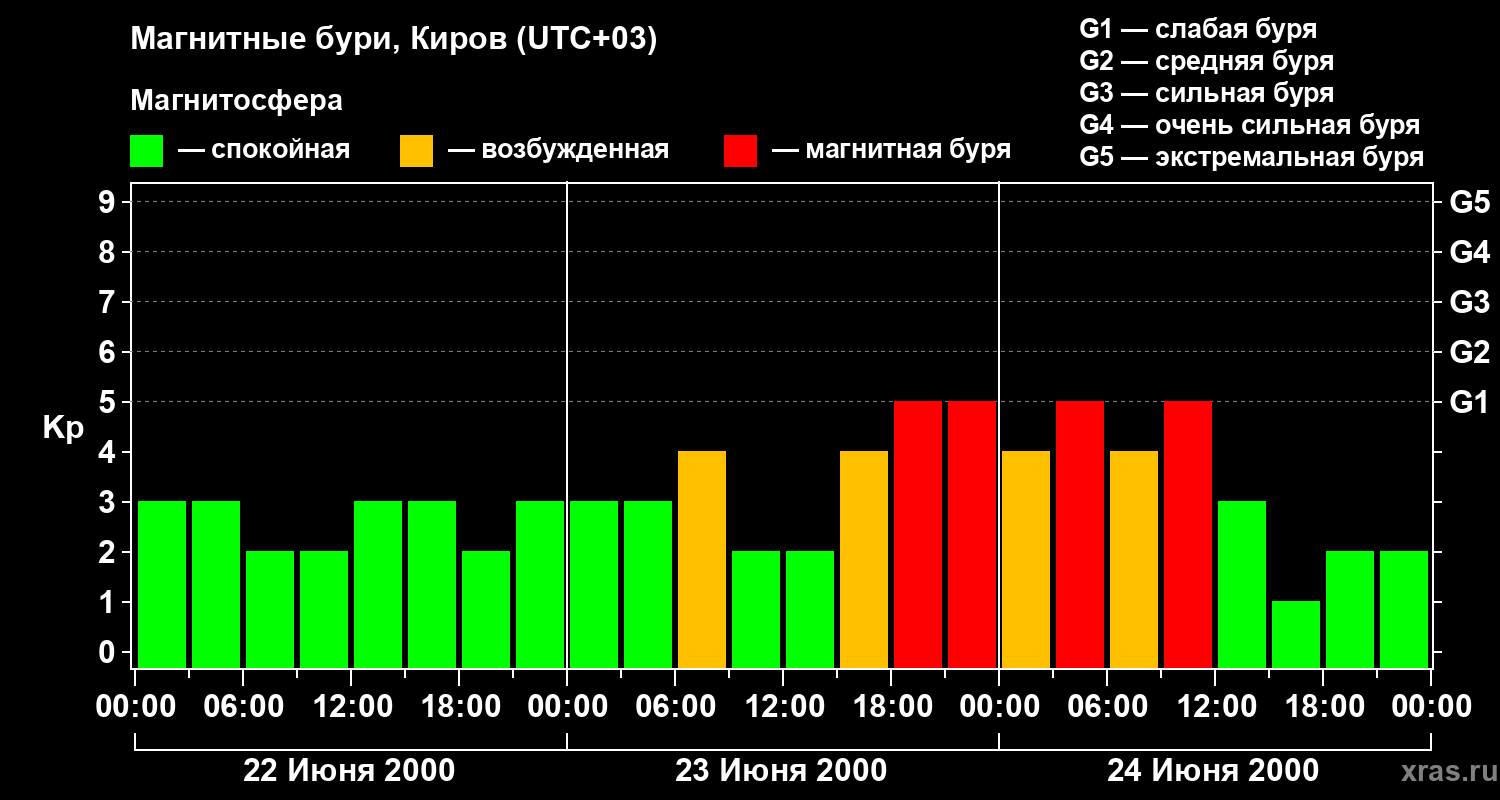 Изменения геомагнитного индекса Kp с 22 по 24 июня 2000 года для средних широт