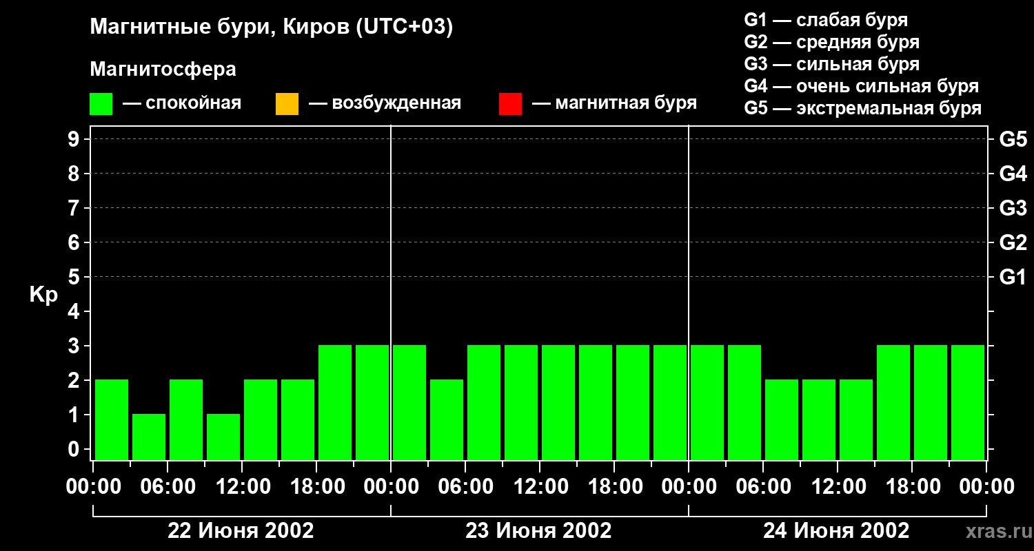 Изменения геомагнитного индекса Kp с 22 по 24 июня 2002 года для средних широт