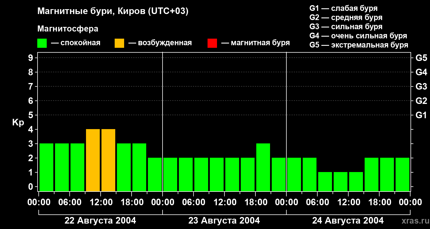 Изменения геомагнитного индекса Kp с 22 по 24 августа 2004 года для средних широт