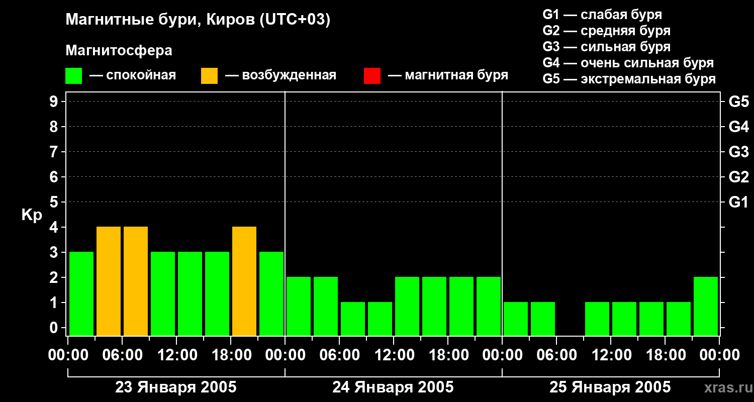 Изменения геомагнитного индекса Kp с 23 по 25 января 2005 года для средних широт