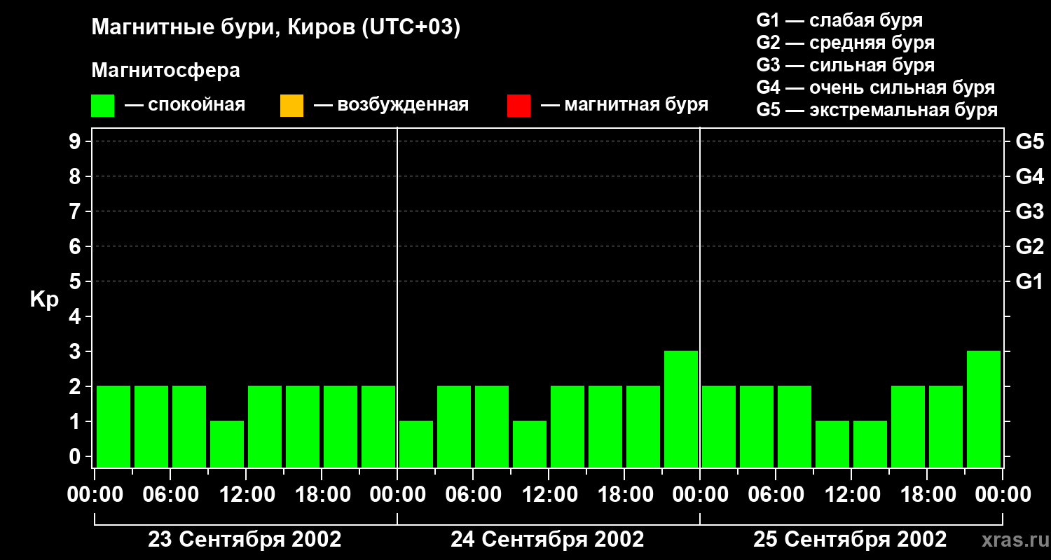 Изменения геомагнитного индекса Kp с 23 по 25 сентября 2002 года для средних широт
