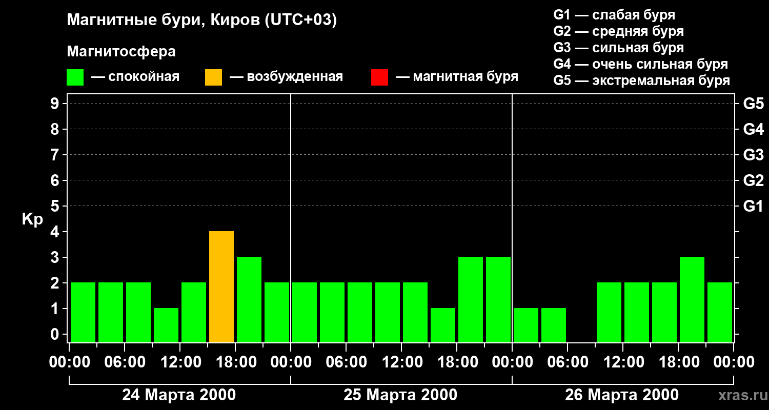 Изменения геомагнитного индекса Kp с 24 по 26 марта 2000 года для средних широт