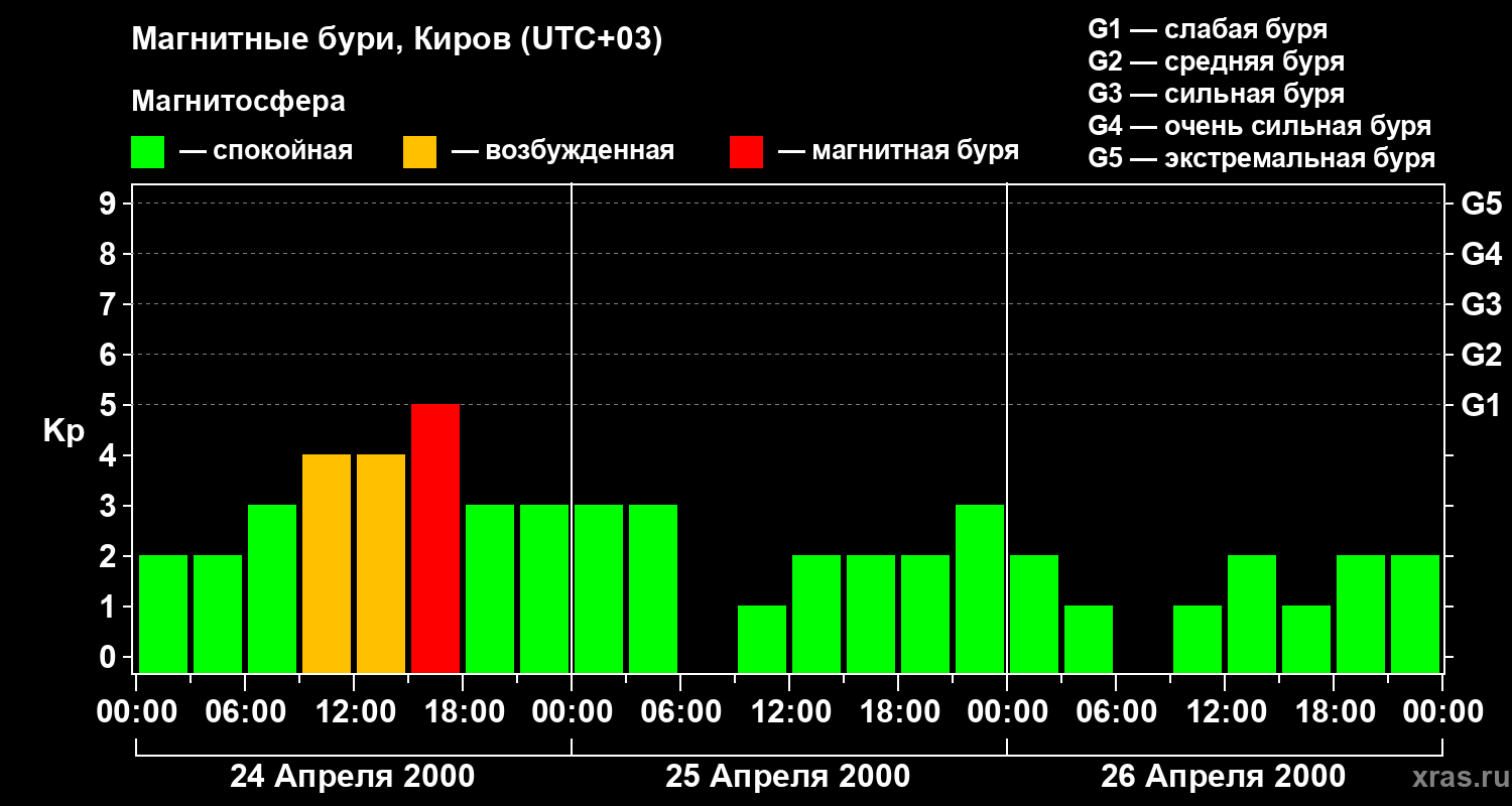 Изменения геомагнитного индекса Kp с 24 по 26 апреля 2000 года для средних широт