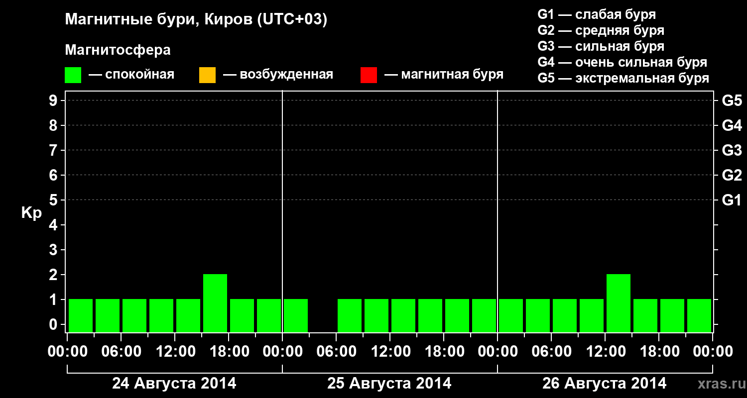 Изменения геомагнитного индекса Kp с 24 по 26 августа 2014 года для средних широт