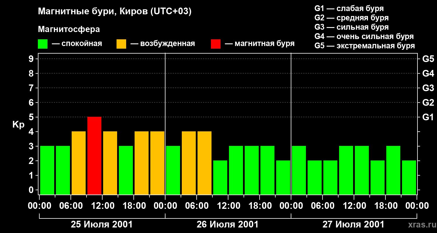 Изменения геомагнитного индекса Kp с 25 по 27 июля 2001 года для средних широт