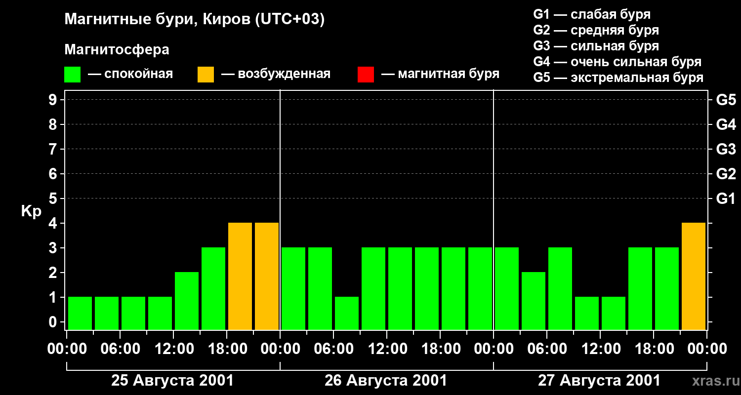Изменения геомагнитного индекса Kp с 25 по 27 августа 2001 года для средних широт