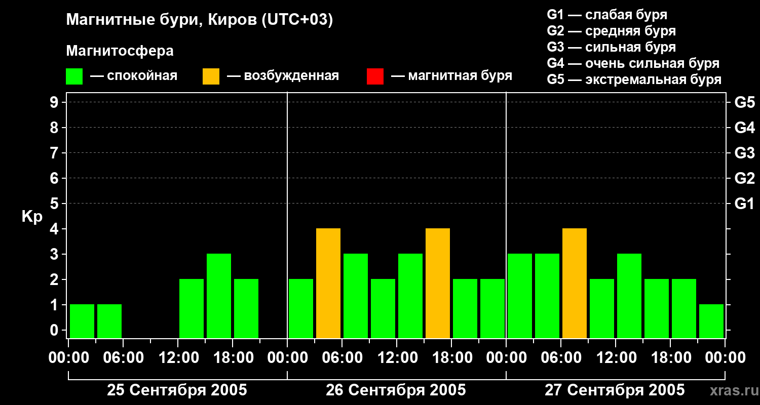 Изменения геомагнитного индекса Kp с 25 по 27 сентября 2005 года для средних широт
