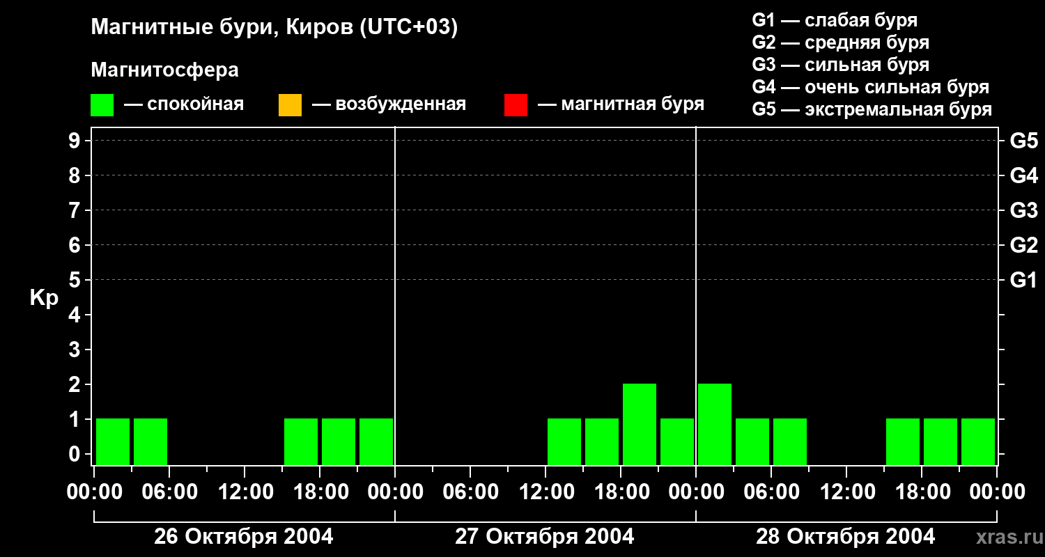 Изменения геомагнитного индекса Kp с 26 по 28 октября 2004 года для средних широт