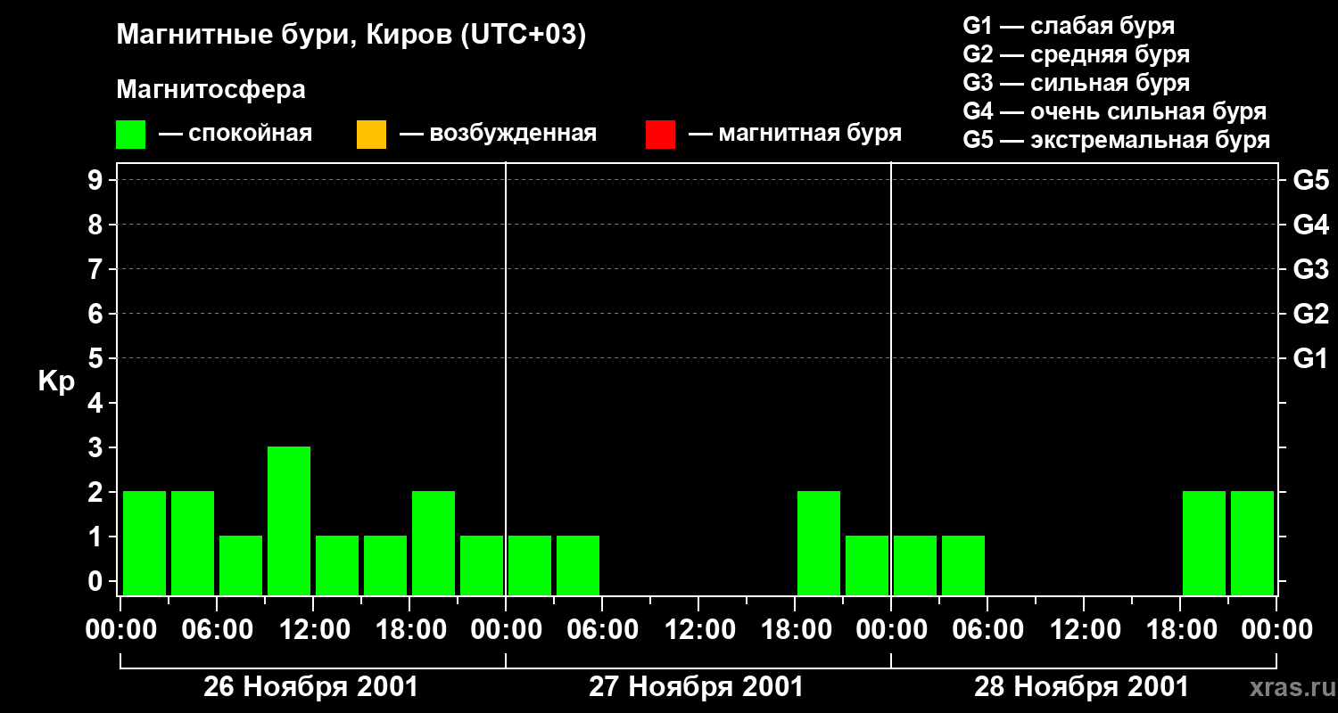 Изменения геомагнитного индекса Kp с 26 по 28 ноября 2001 года для средних широт