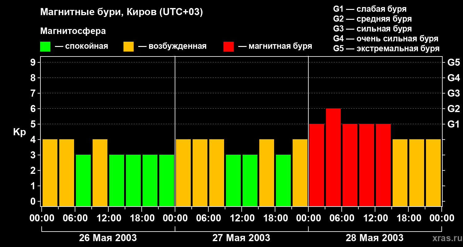 Изменения геомагнитного индекса Kp с 26 по 28 мая 2003 года для средних широт