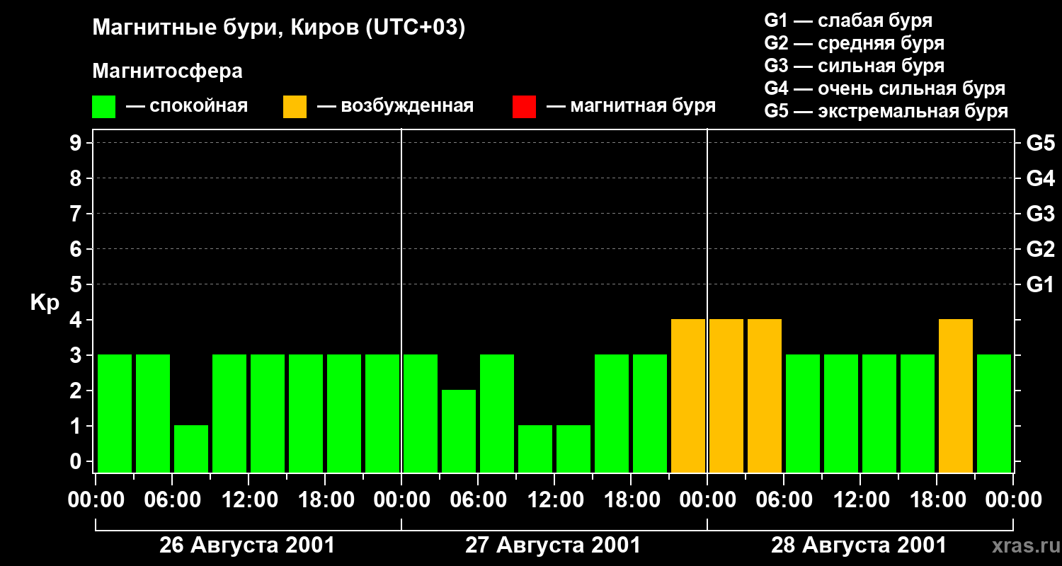 Изменения геомагнитного индекса Kp с 26 по 28 августа 2001 года для средних широт