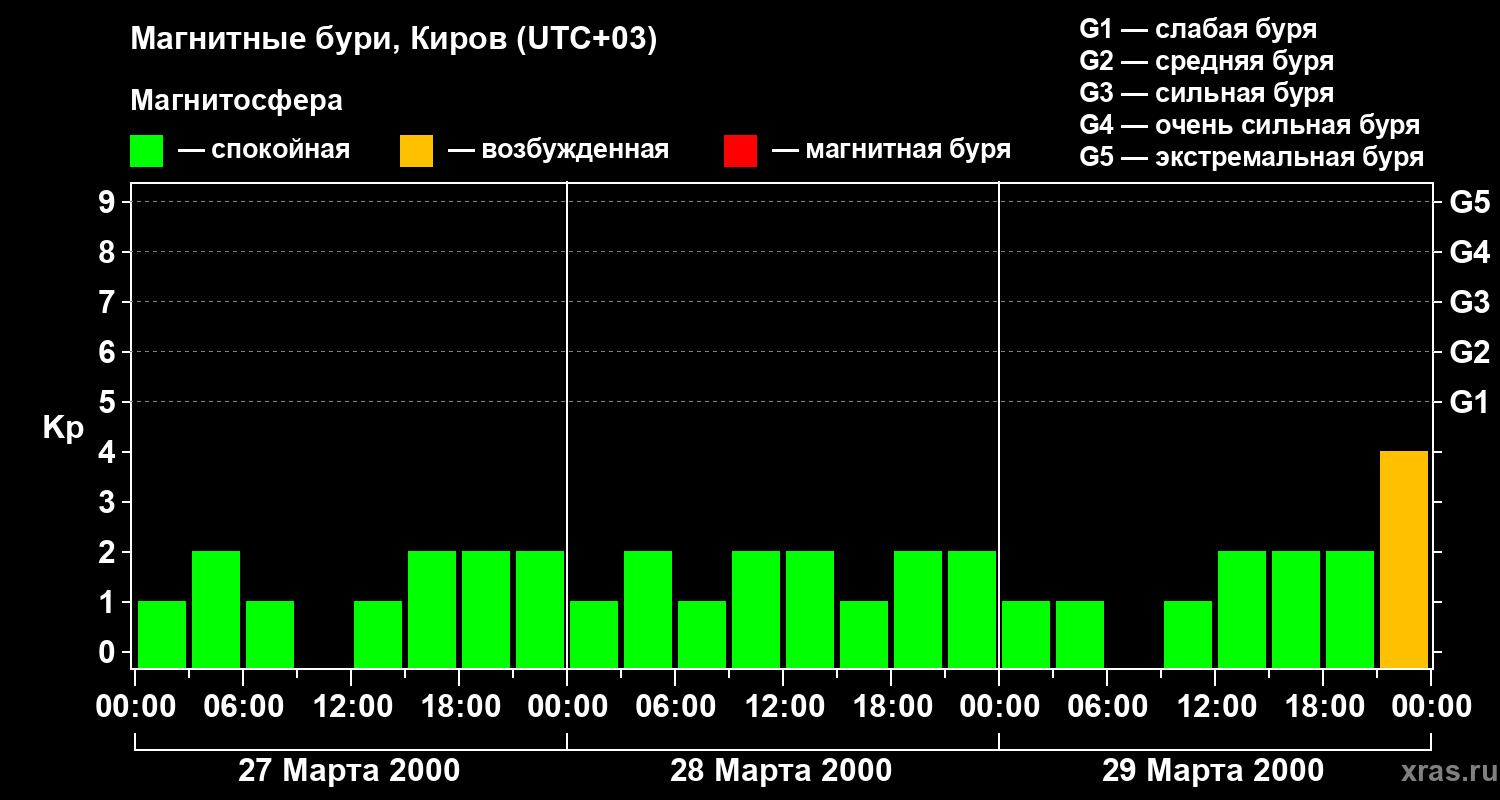 Изменения геомагнитного индекса Kp с 27 по 29 марта 2000 года для средних широт