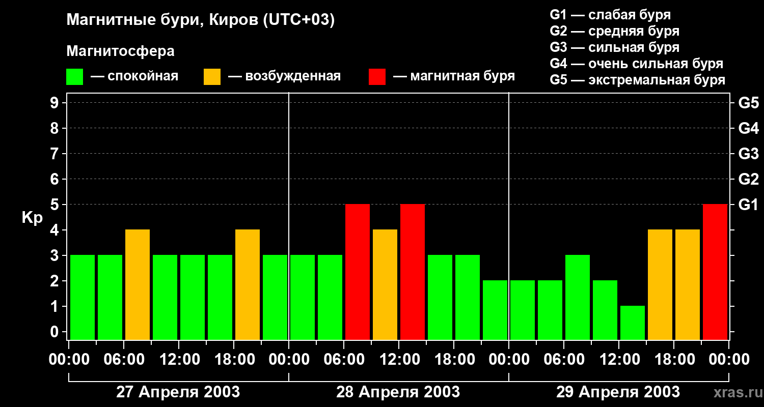 Изменения геомагнитного индекса Kp с 27 по 29 апреля 2003 года для средних широт