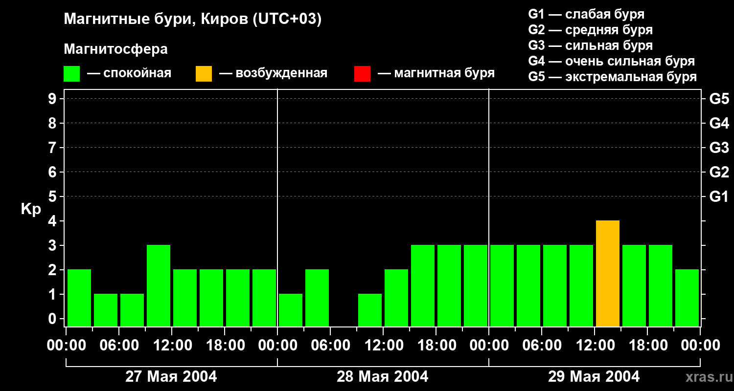 Изменения геомагнитного индекса Kp с 27 по 29 мая 2004 года для средних широт
