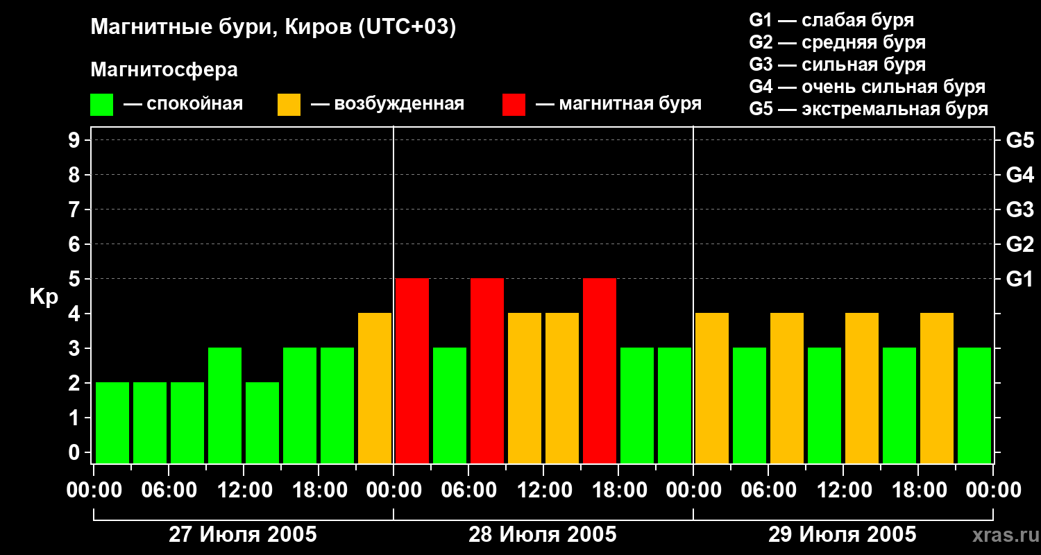 Изменения геомагнитного индекса Kp с 27 по 29 июля 2005 года для средних широт