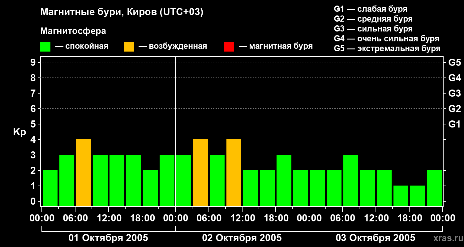 Изменения геомагнитного индекса Kp с 1 по 3 октября 2005 года для средних широт