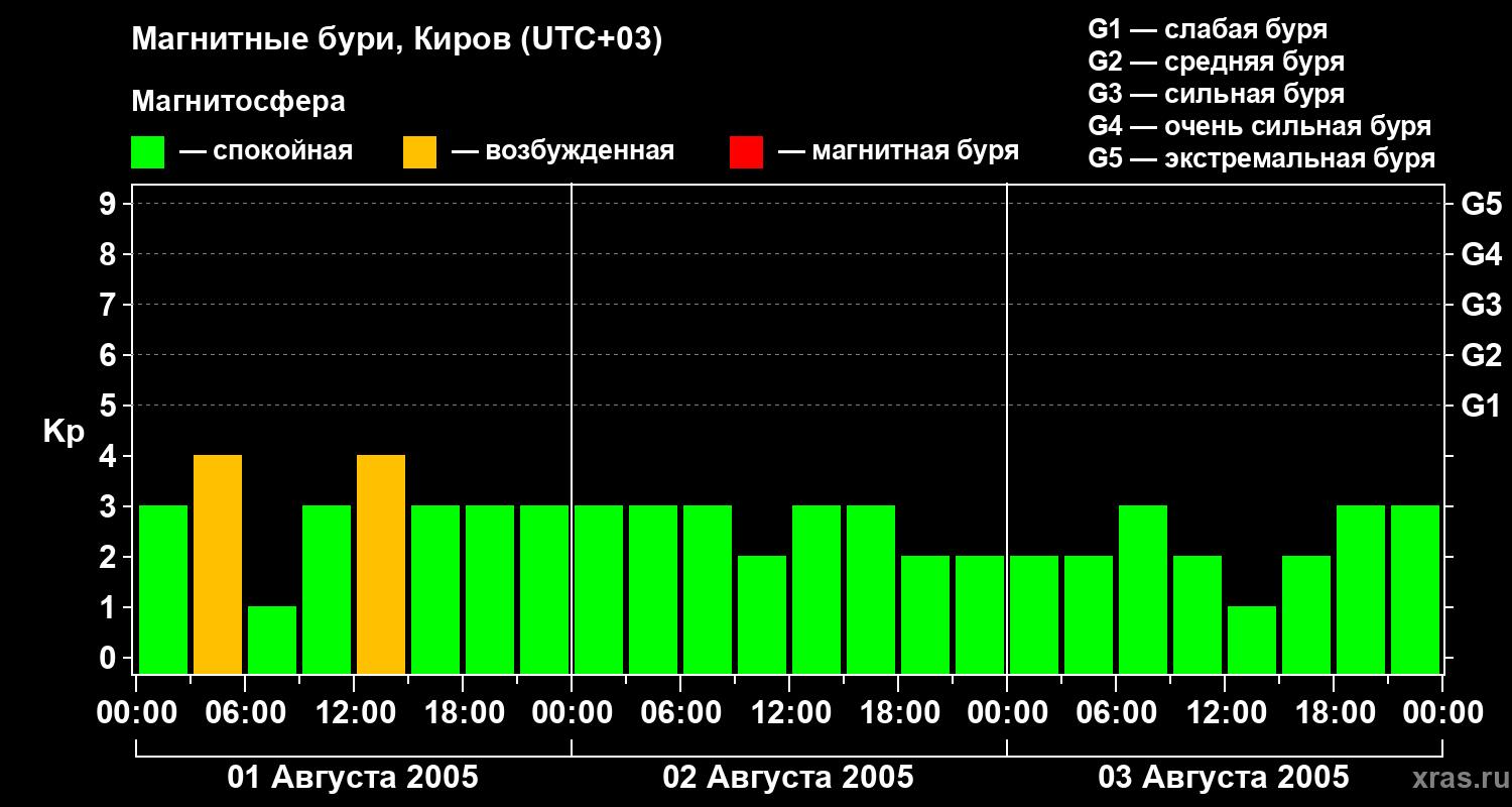 Изменения геомагнитного индекса Kp с 1 по 3 августа 2005 года для средних широт