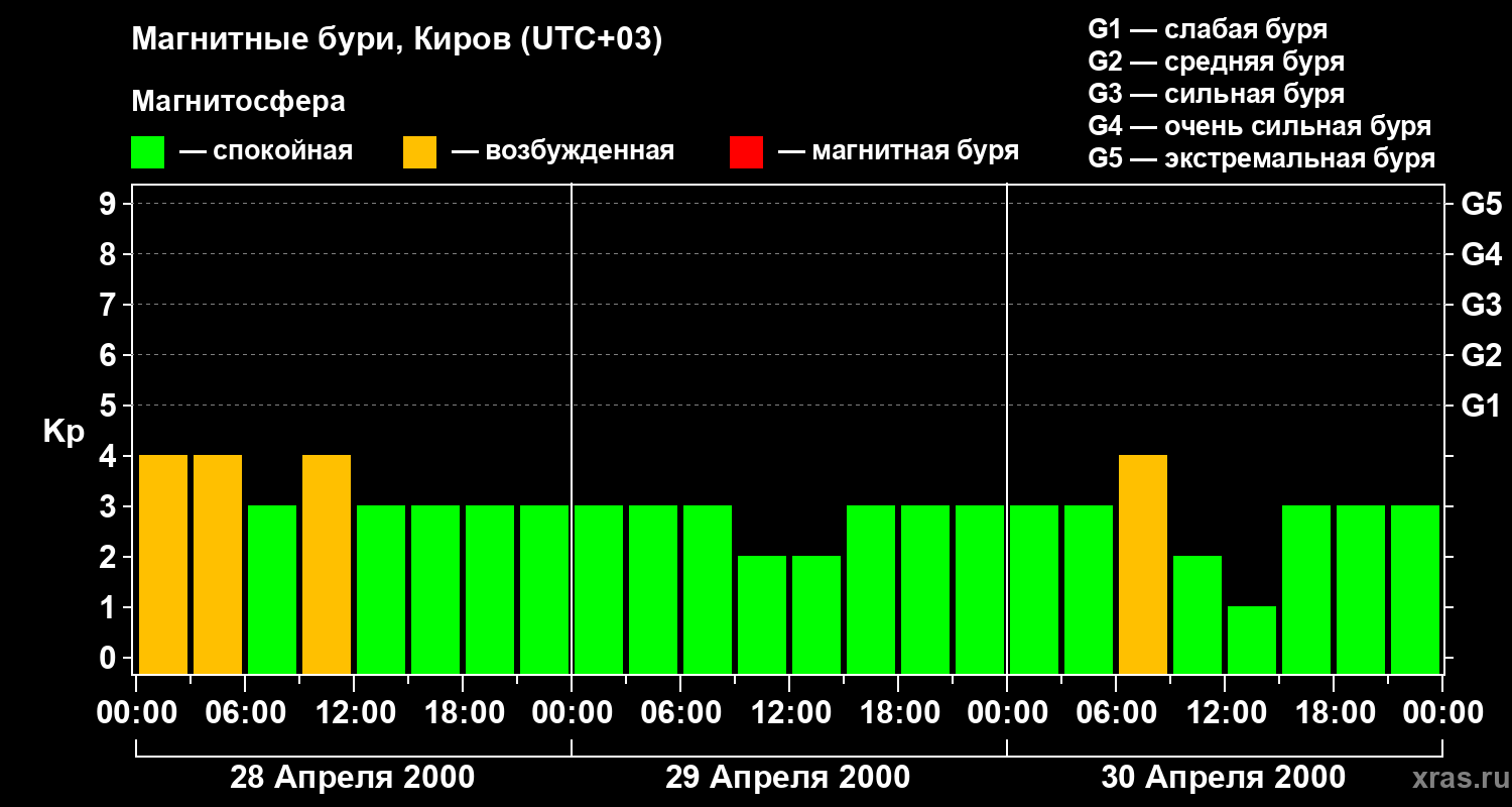 Изменения геомагнитного индекса Kp с 28 по 30 апреля 2000 года для средних широт