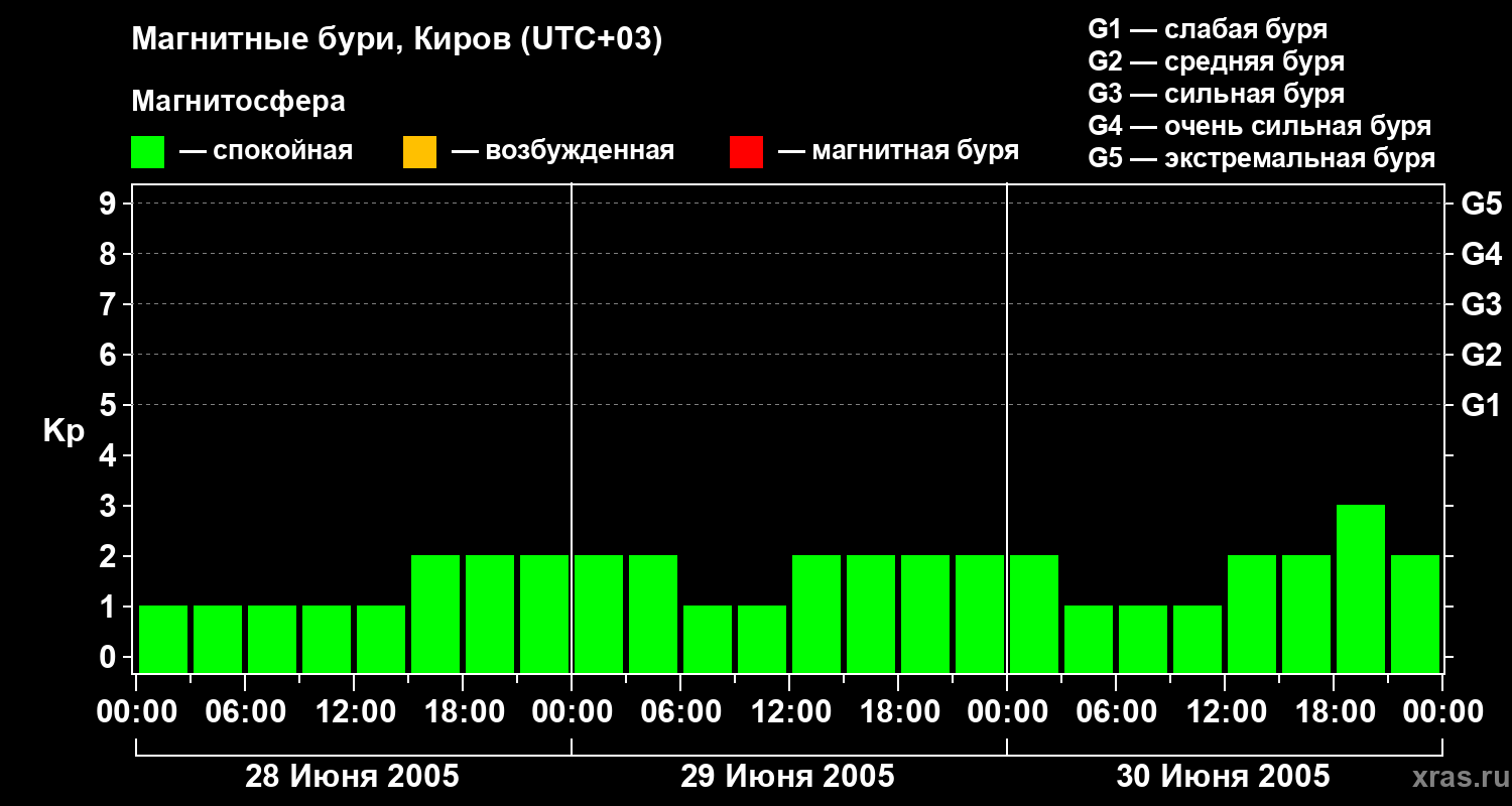 Изменения геомагнитного индекса Kp с 28 по 30 июня 2005 года для средних широт