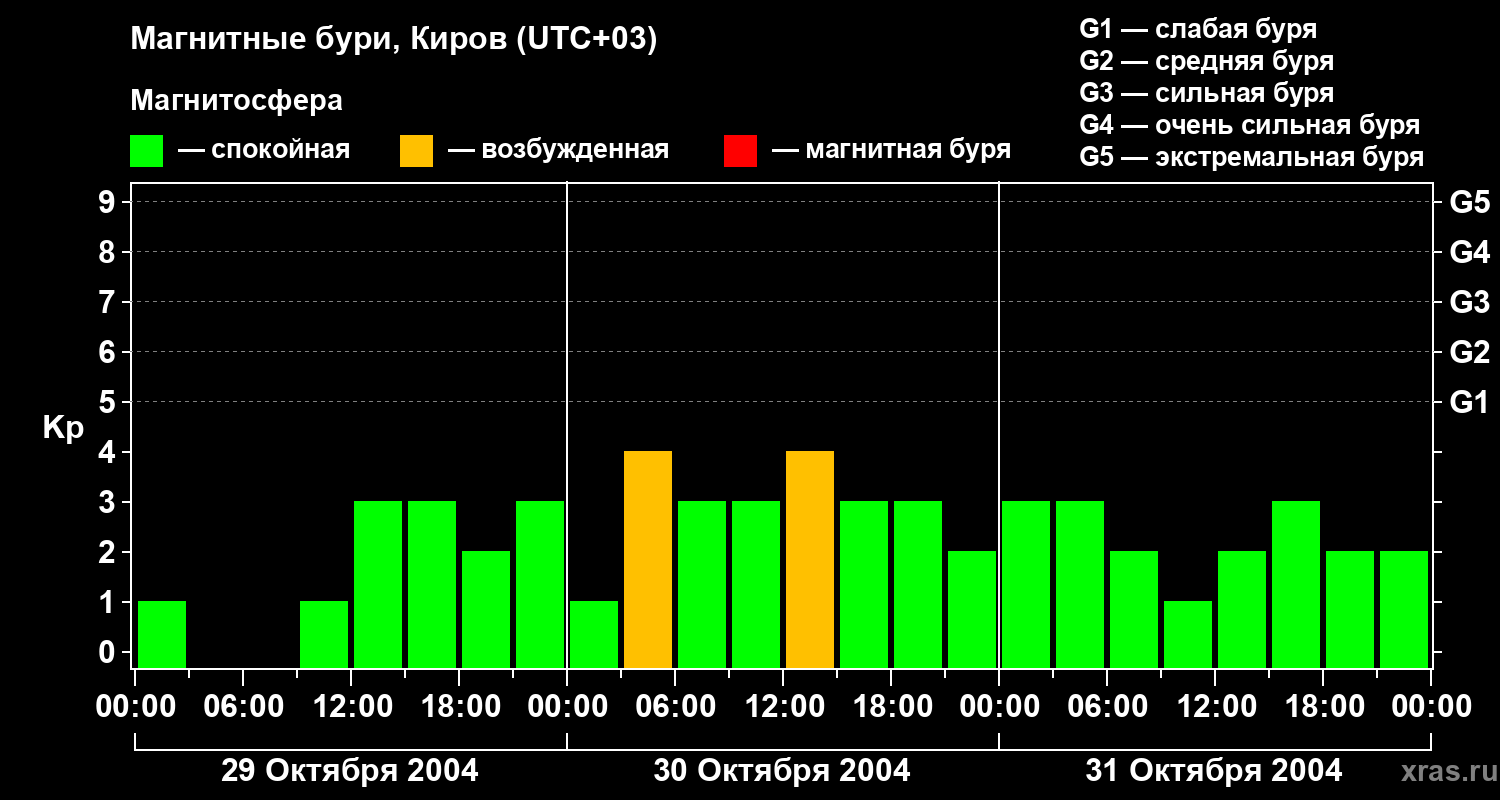 Изменения геомагнитного индекса Kp с 29 по 31 октября 2004 года для средних широт