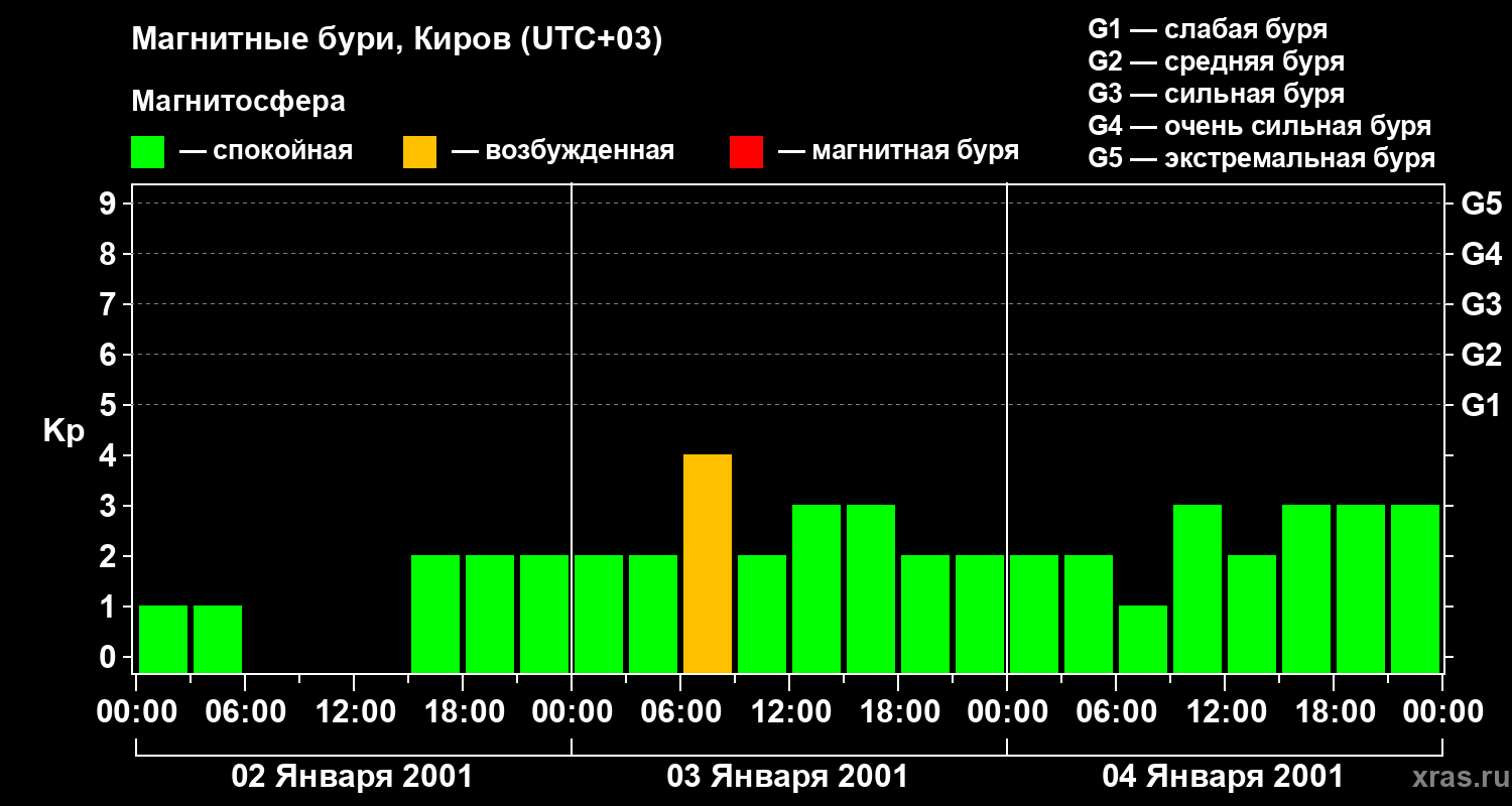 Изменения геомагнитного индекса Kp с 2 по 4 января 2001 года для средних широт