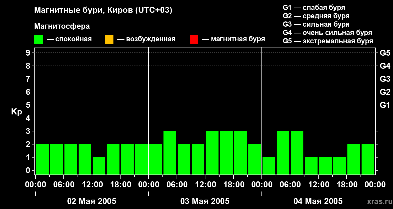 Изменения геомагнитного индекса Kp с 2 по 4 мая 2005 года для средних широт