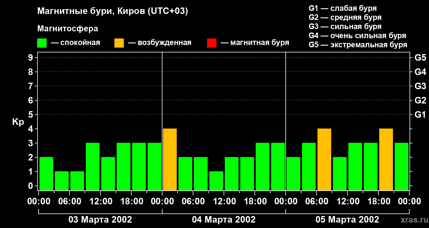 Изменения геомагнитного индекса Kp с 3 по 5 марта 2002 года для средних широт