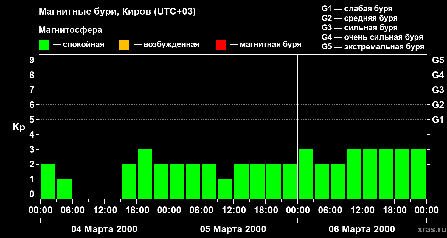 Изменения геомагнитного индекса Kp с 4 по 6 марта 2000 года для средних широт
