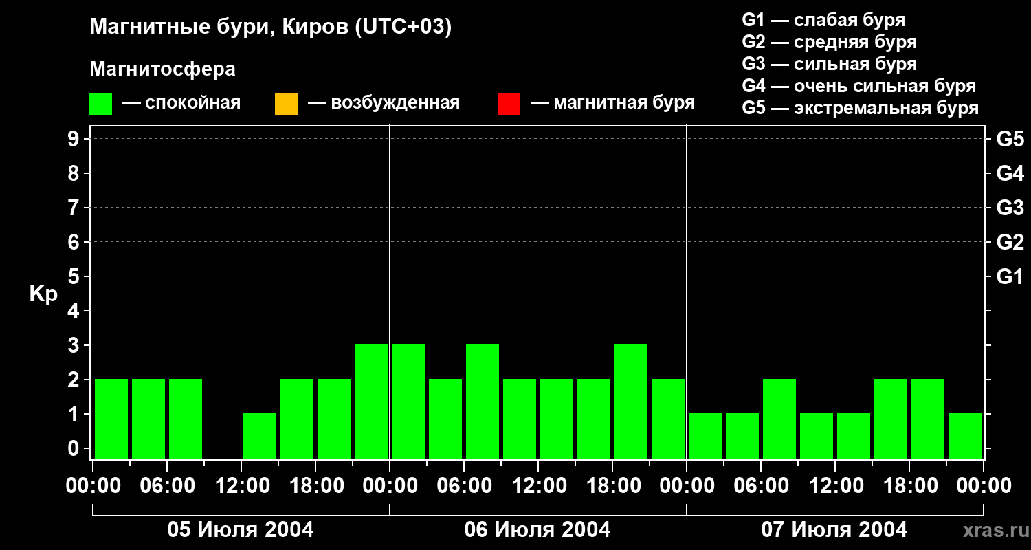 Изменения геомагнитного индекса Kp с 5 по 7 июля 2004 года для средних широт