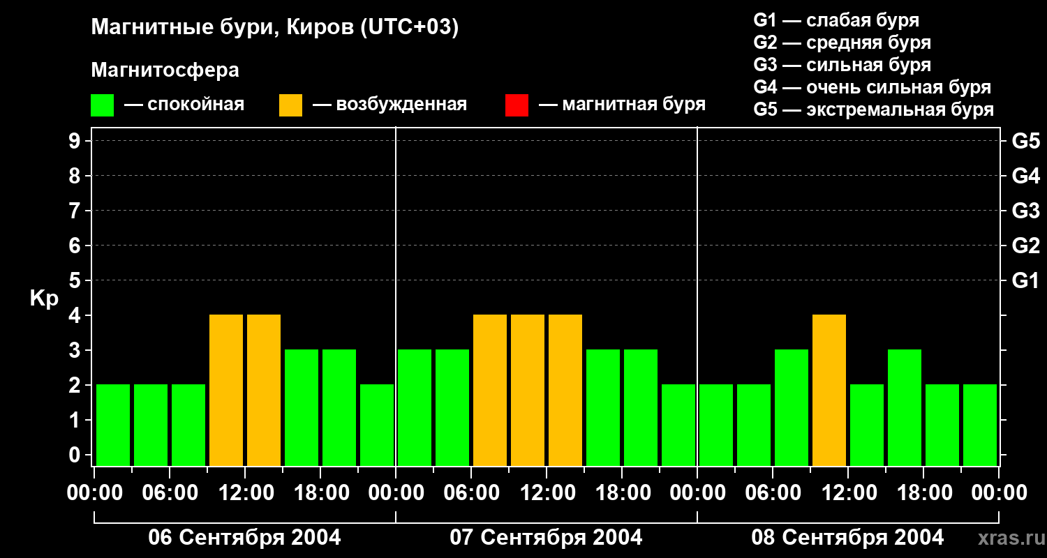 Изменения геомагнитного индекса Kp с 6 по 8 сентября 2004 года для средних широт