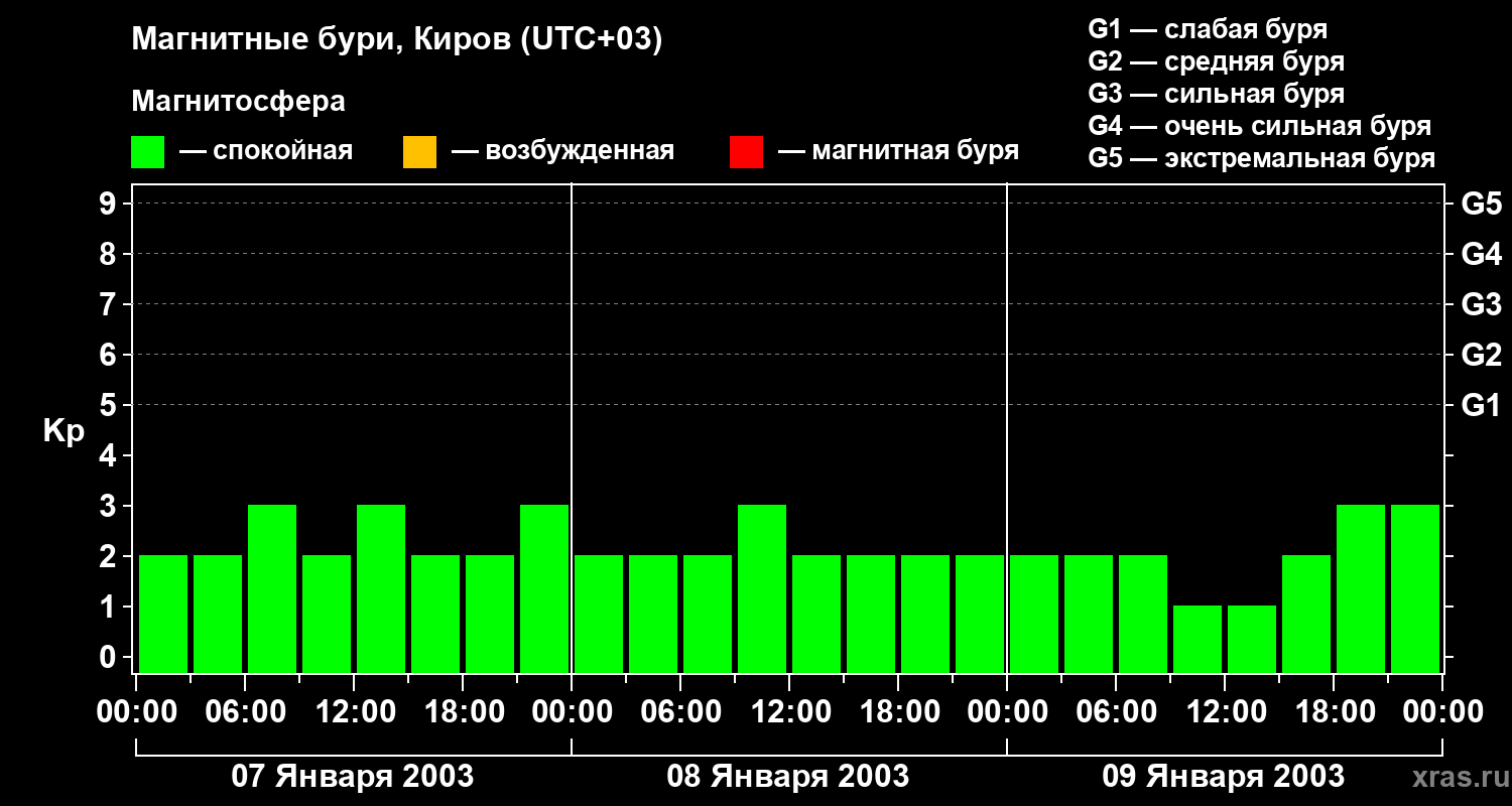 Изменения геомагнитного индекса Kp с 7 по 9 января 2003 года для средних широт
