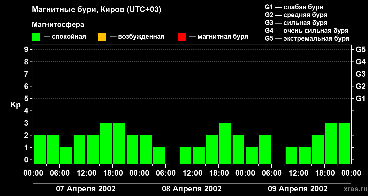 Изменения геомагнитного индекса Kp с 7 по 9 апреля 2002 года для средних широт