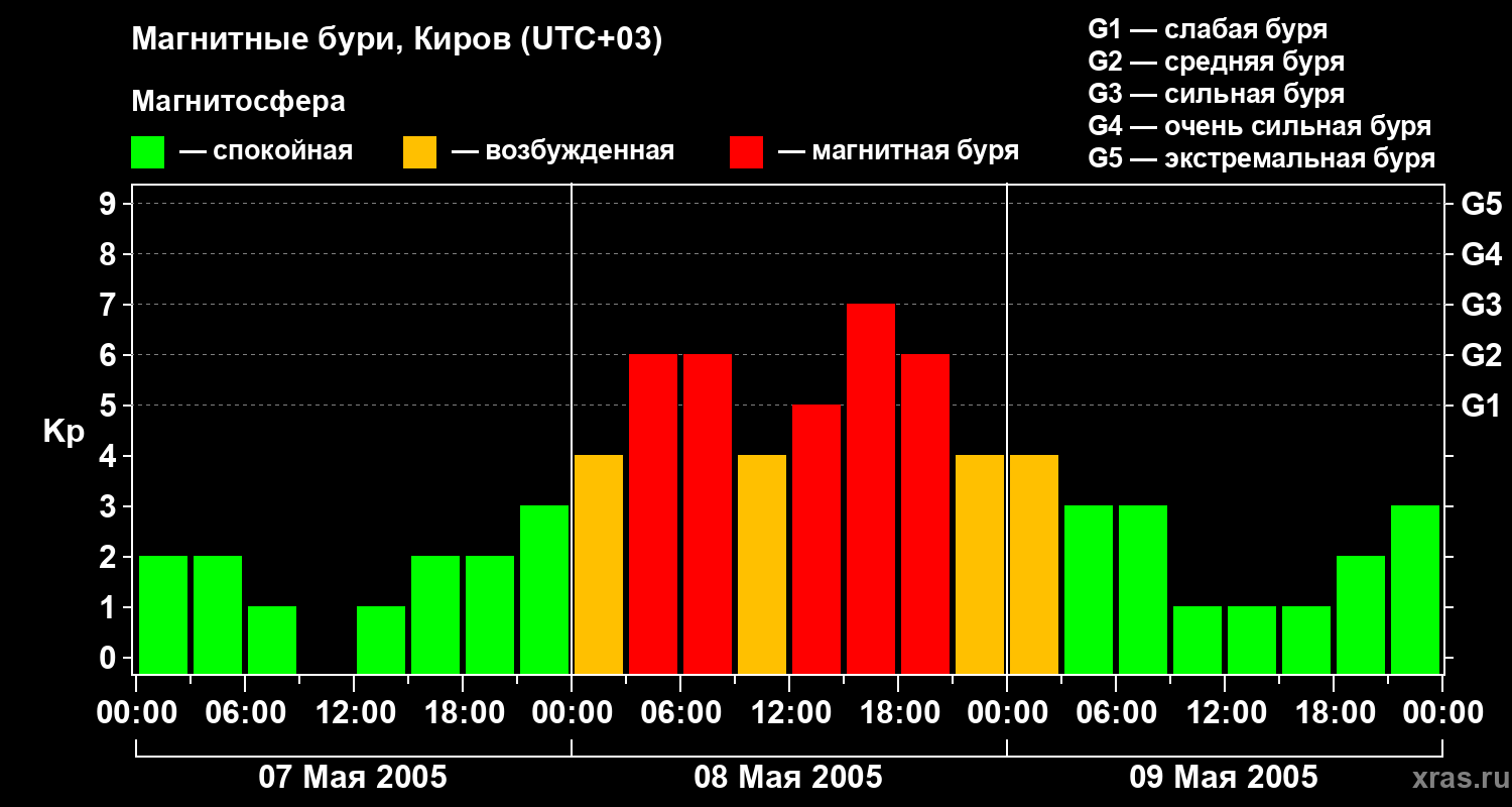 Изменения геомагнитного индекса Kp с 7 по 9 мая 2005 года для средних широт