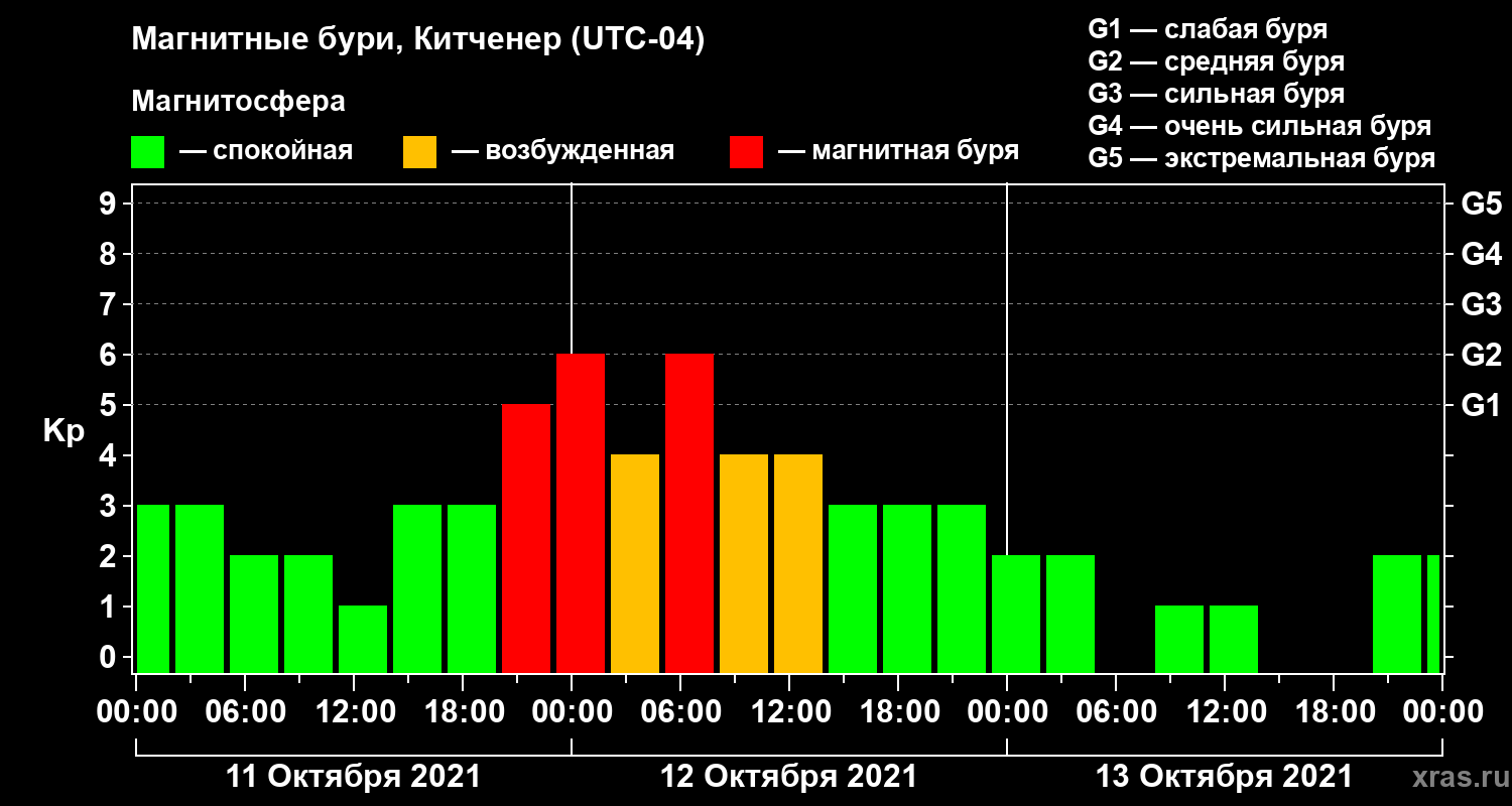 Изменения геомагнитного индекса Kp с 11 по 13 октября 2021 года для средних широт