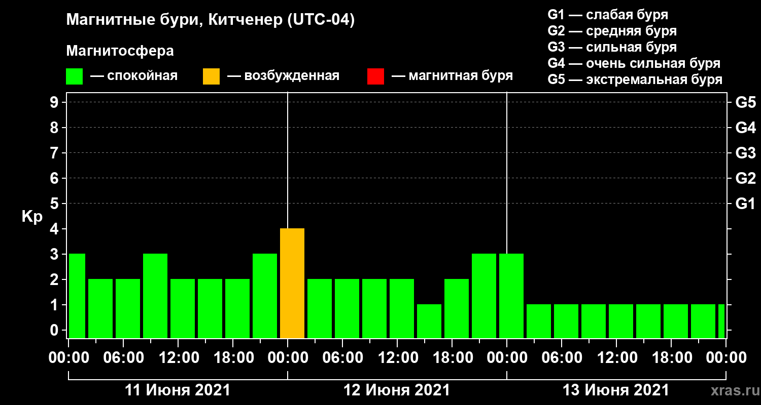 Изменения геомагнитного индекса Kp с 11 по 13 июня 2021 года для средних широт