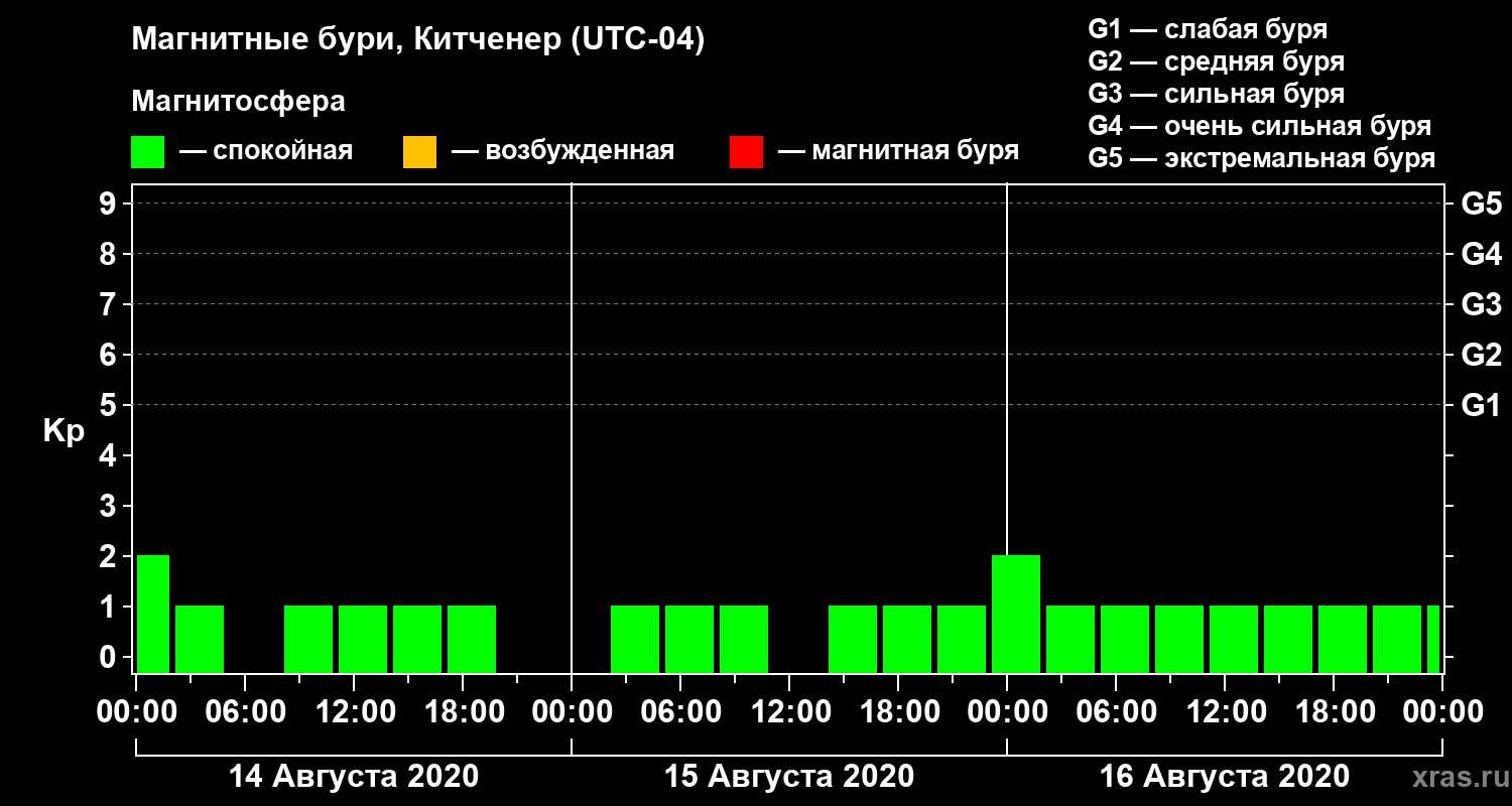 Изменения геомагнитного индекса Kp с 14 по 16 августа 2020 года для средних широт
