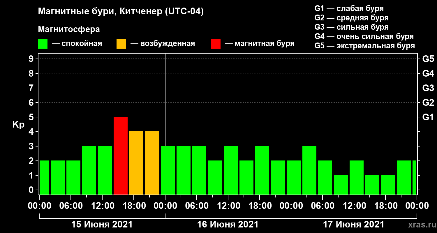 Изменения геомагнитного индекса Kp с 15 по 17 июня 2021 года для средних широт