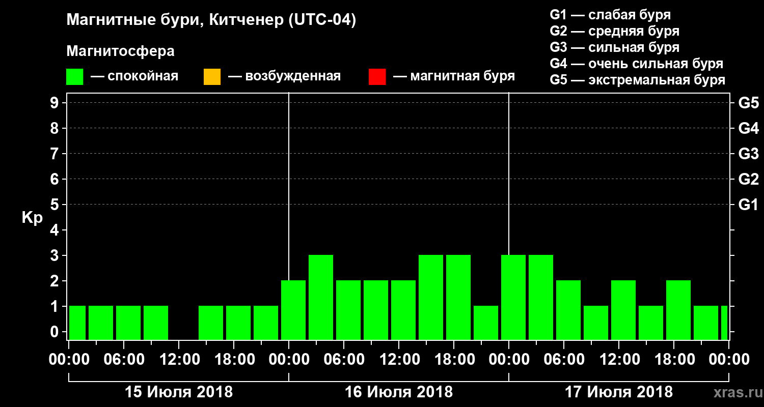 Изменения геомагнитного индекса Kp с 15 по 17 июля 2018 года для средних широт
