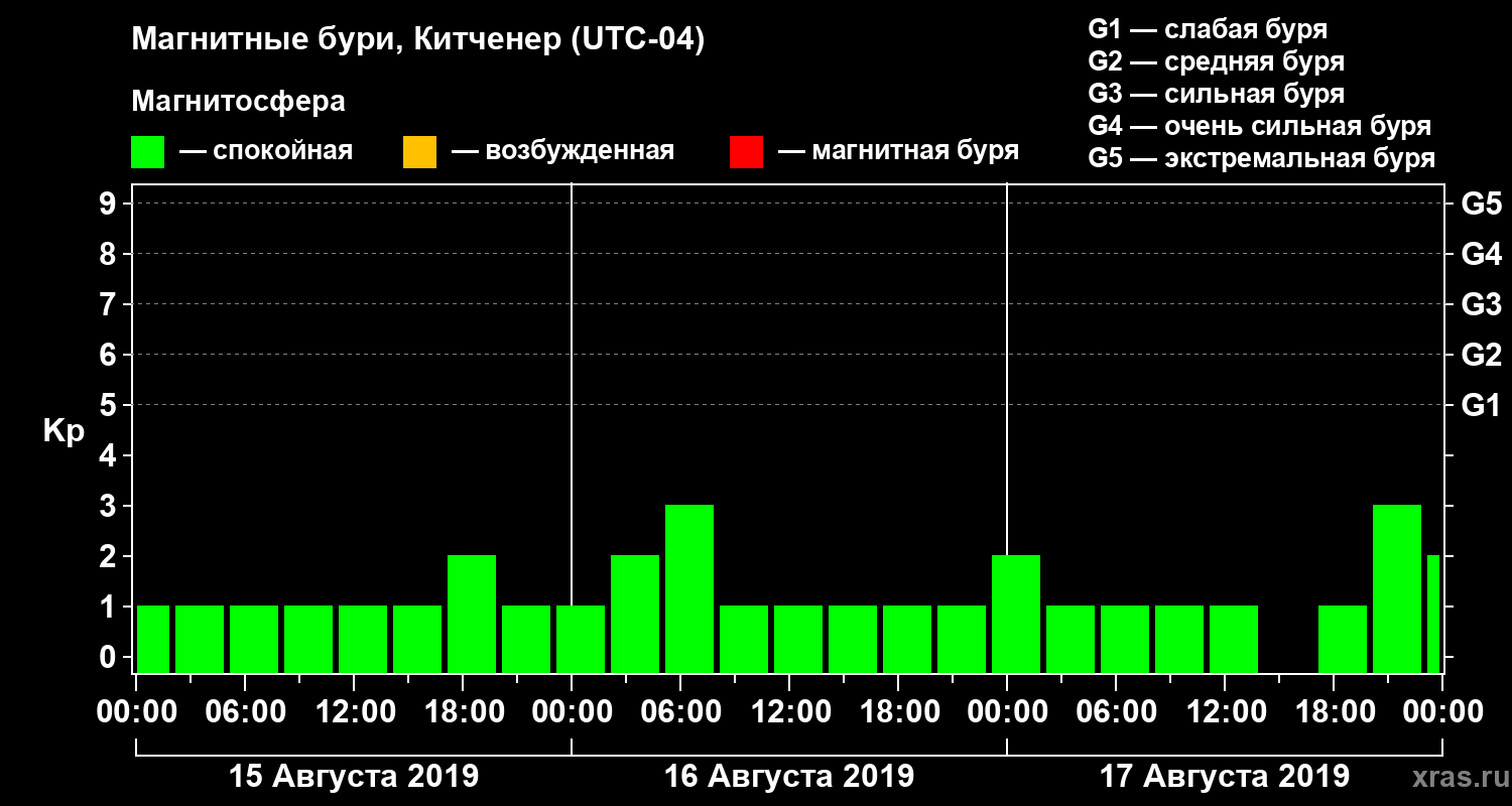 Изменения геомагнитного индекса Kp с 15 по 17 августа 2019 года для средних широт