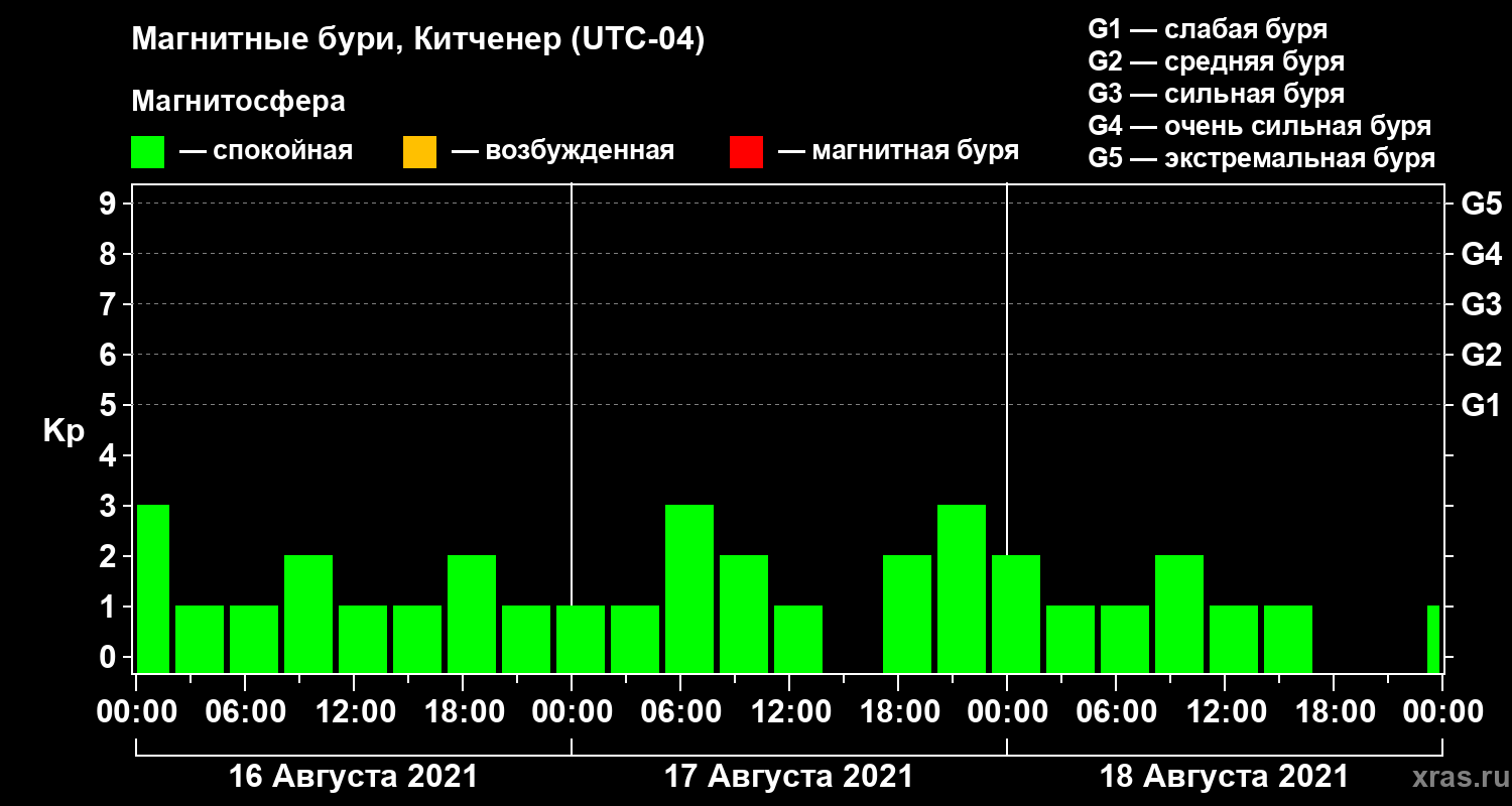 Изменения геомагнитного индекса Kp с 16 по 18 августа 2021 года для средних широт