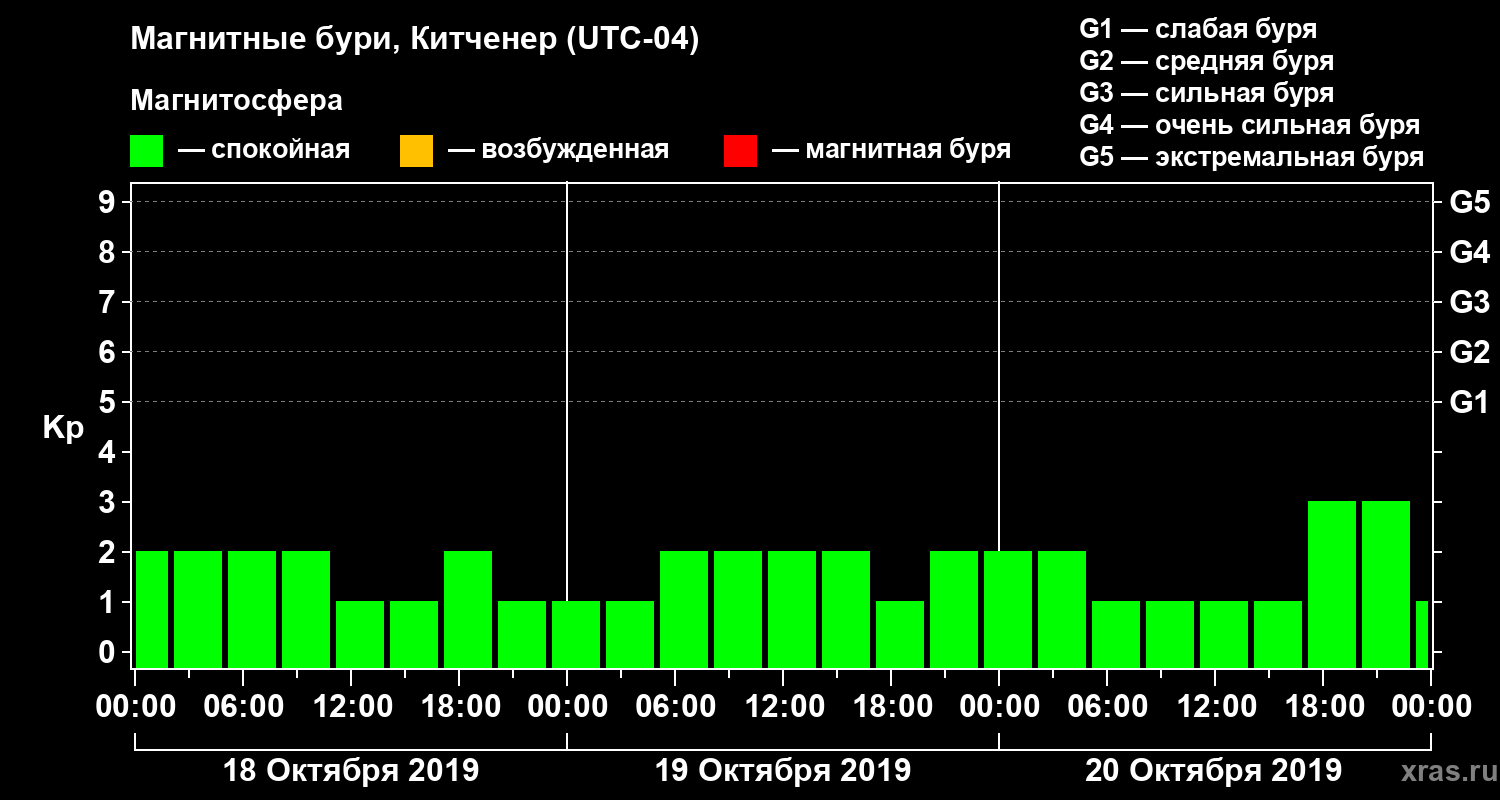 Изменения геомагнитного индекса Kp с 18 по 20 октября 2019 года для средних широт