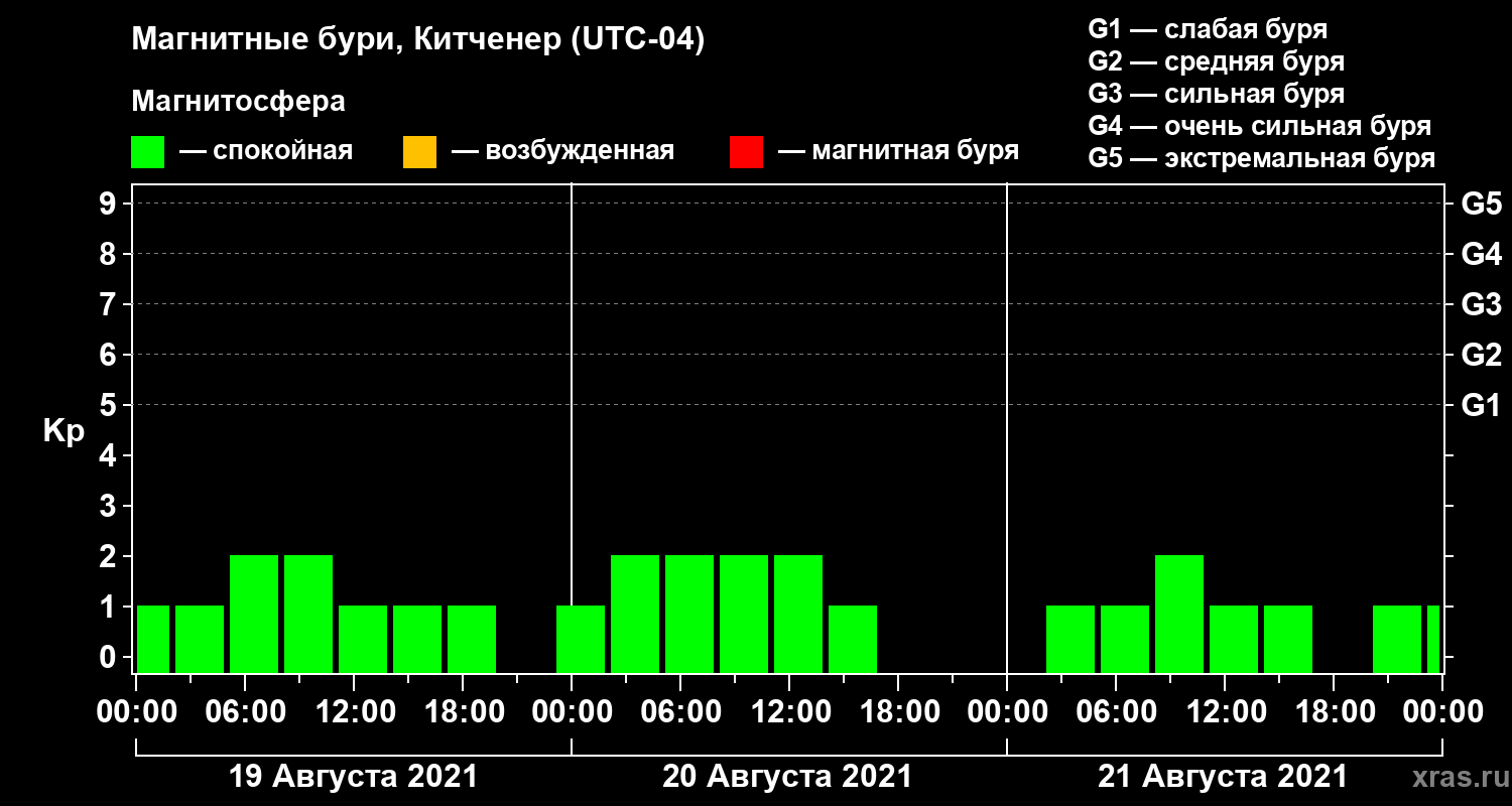 Изменения геомагнитного индекса Kp с 19 по 21 августа 2021 года для средних широт